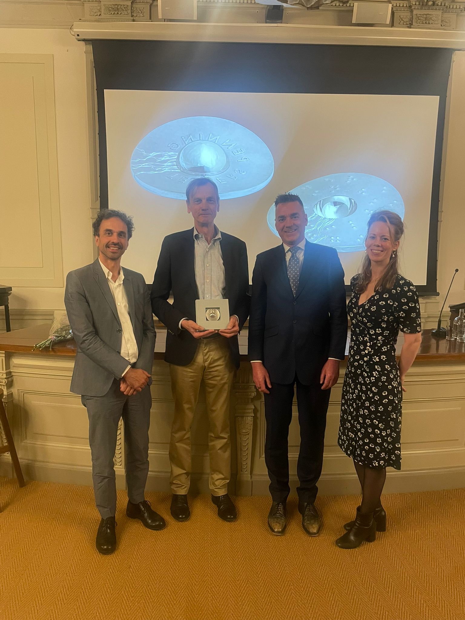 Terry van Druten, Carel van Tuyll van Serooskerken holding the Teylers Medal of Honour, Stan Kaatee and Marleen Ram